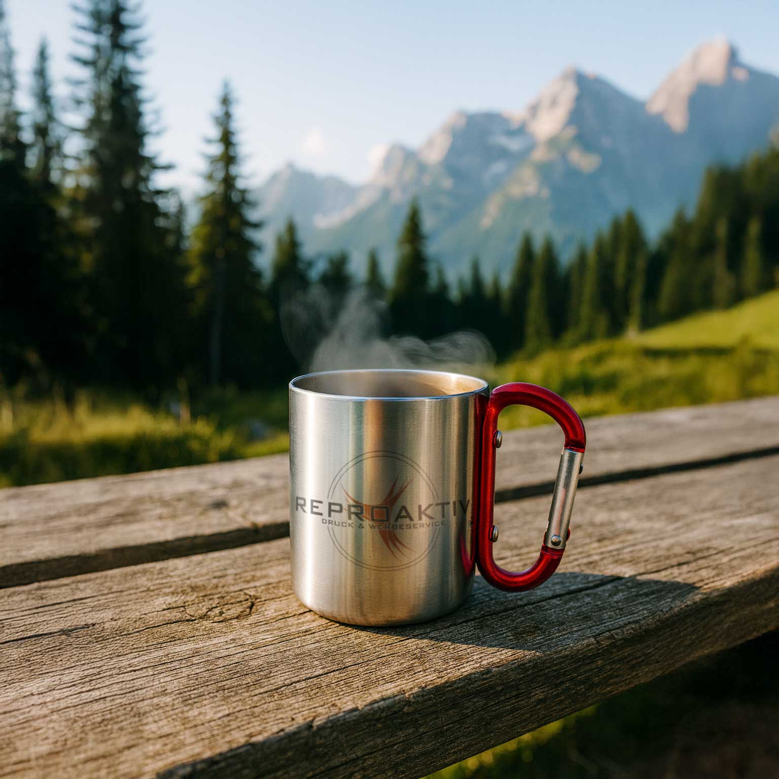 Bedruckbarer Thermobecher mit Karabiner, die perfekte Begleitung für Outdoor-Abenteuer.